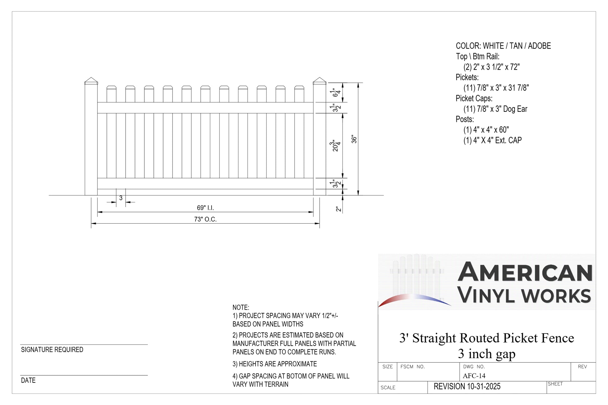 3' Tall x 6' Wide Straight Routed Picket Fence Panel w/ 3" Gap For Vinyl Fences (AFC-14)