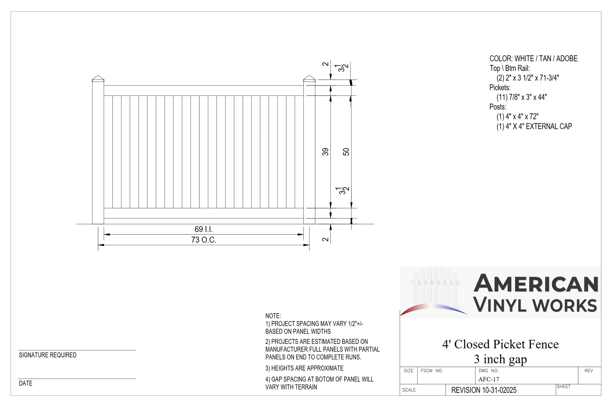 4' Tall x 6' Wide Closed Picket Fence Panel w/ 3" Gap For Vinyl Fences (AFC-17)