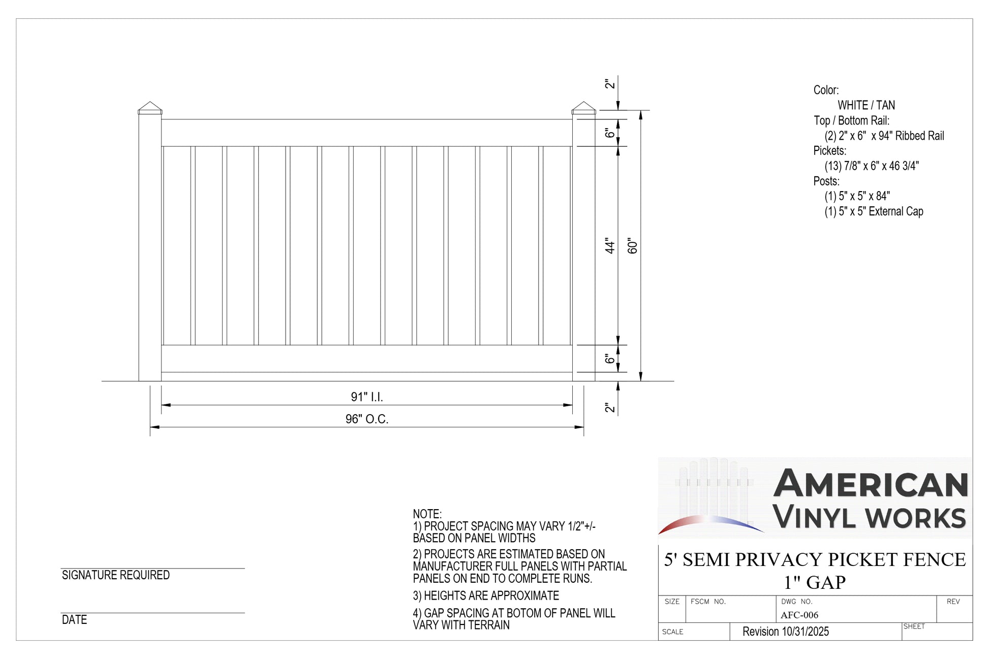 5' Tall x 8' Wide Semi-Privacy Fence Panel For Vinyl Fences (AFC-006)