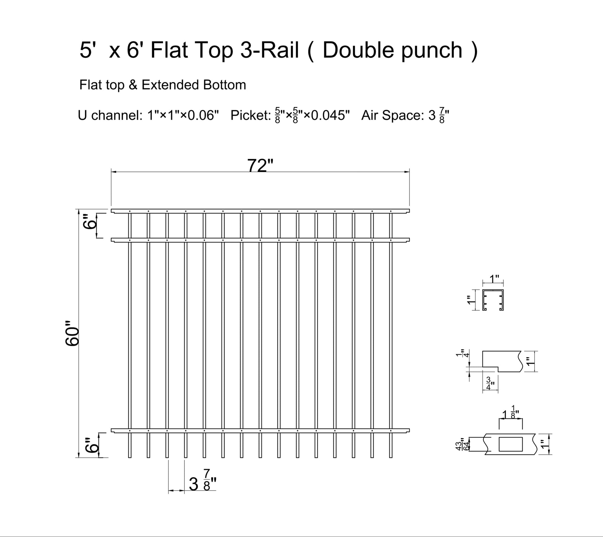 Ornamental Aluminum Flat Top 6' Wide x 5' Tall 3-Rail Fence Panel with 3-7/8" Air Space