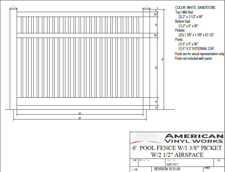 [Price Per Foot - AFC-017] 6' Tall Pool Closed Picket Fence with 2-1/2" Air Space For Vinyl Fences