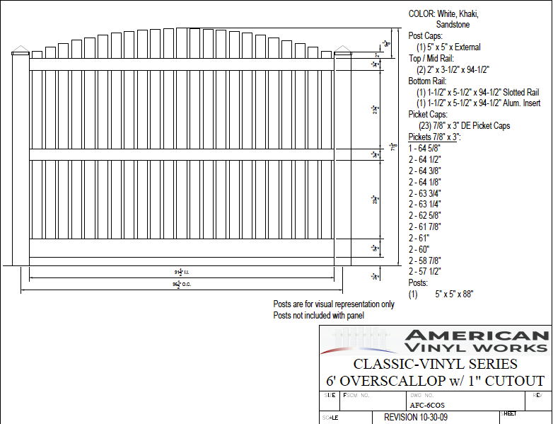 [Price Per Foot - AFC-6COS] 6' Tall Overscallop Picket Fence with 1" Air Space For Vinyl Fences